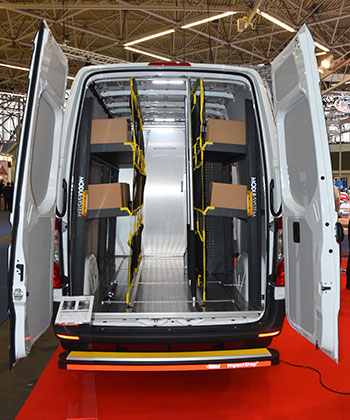 Będzie można zobaczyć również opatentowane składane półki firmy Modul-System wykonane z ultra wysokiej wytrzymałości stali. Te lekkie półki cechuje nośność 120 kg i są bardzo łatwe w obsłudze. Koniecznie zobacz także nasze nowe rozwiązanie siatkowe, zapobiegające wypadaniu opakowań z półki w razie nagłego hamowania. Dzięki modułowej funkcji klipsów, rozmieszczenie siatek można bardzo łatwo zmienić.