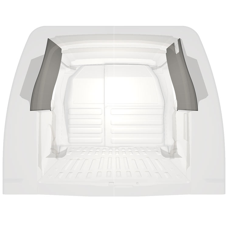Lekka, pełna okładzina do ścian wewnętrznych modeli Citroën Berlingo/Peugeot Partner z podwójnymi drzwiami bocznymi. Okładziny tworzą jasne i przyjemne miejsce pracy i są łatwe do wycierania, co ułatwia zachowanie czystości.