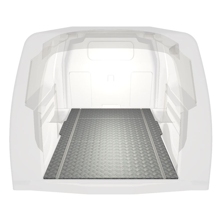 Lekkie i solidne standardowe podłogi do samochodów dostawczych Berlingo/Partner/Combo 19- wyposażone w antypoślizgową aluminiową blachę ryflowaną i szyny na ładunek (wzdłużne) umożliwiające szybki i bezpieczny montaż systemów regałowych oraz innych akcesoriów.