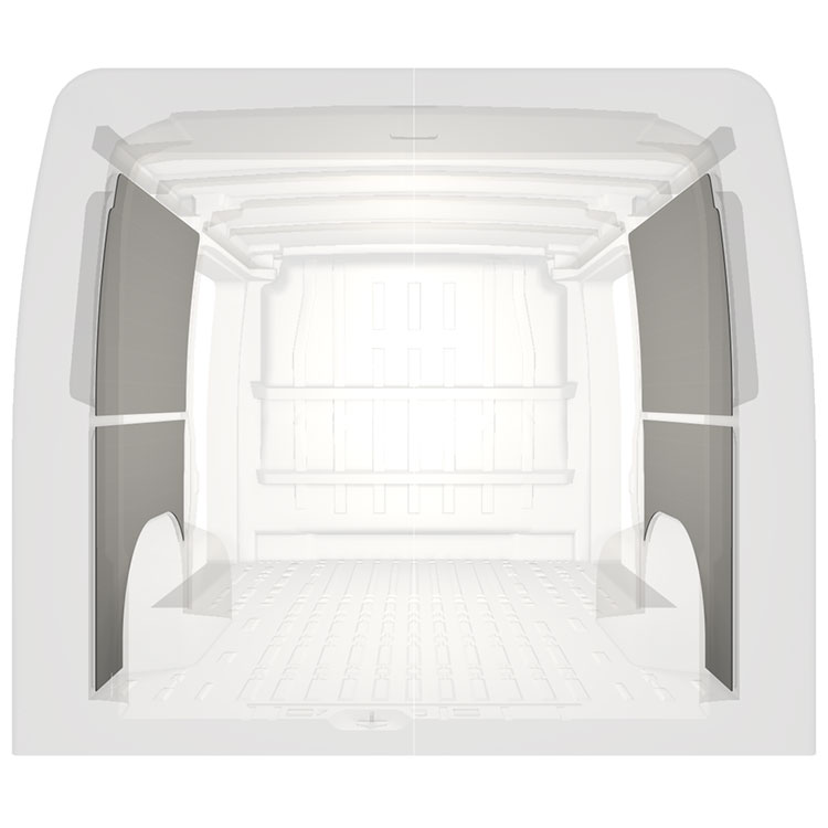 Lekka, wycięta fabrycznie okładzina do ścian wewnętrznych modeli Citroën Jumper / Peugeot Boxer / Fiat Ducato z podwójnymi drzwiami bocznymi. Okładziny tworzą jasne i przyjemne miejsce pracy i są łatwe do wycierania, co ułatwia zachowanie czystości.