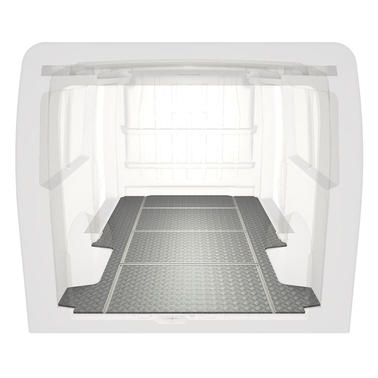 Lekkie i solidne podłogi z szynami poprzecznymi do samochodów dostawczych Citroën Jumper / Peugeot Boxer / Fiat Ducato wyposażone w antypoślizgową aluminiową blachę ryflowaną i szyny na ładunek (wzdłużne oraz poprzeczne) umożliwiające szybki i bezpieczny montaż systemów regałowych oraz innych akcesoriów.