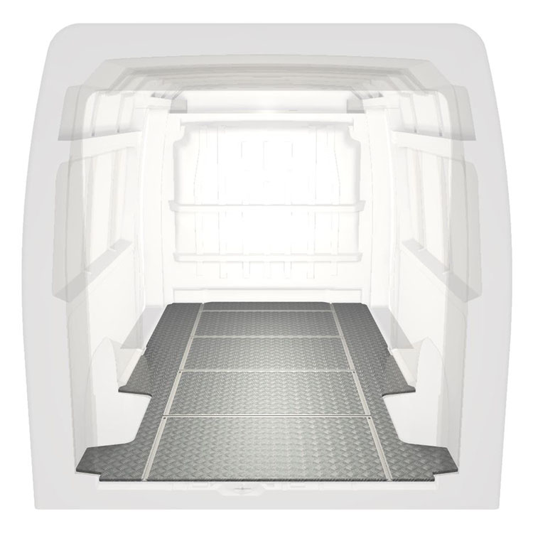 Lekkie i solidne podłogi z szynami poprzecznymi do samochodów dostawczych Citroën Jumper / Peugeot Boxer / Fiat Ducato wyposażone w antypoślizgową aluminiową blachę ryflowaną i szyny na ładunek (wzdłużne oraz poprzeczne) umożliwiające szybki i bezpieczny montaż systemów regałowych oraz innych akcesoriów.