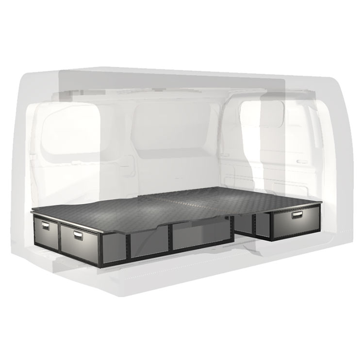 The kit is designed to be fitted on top of a wooden floor. The double floor is equipped with rails for easy installation of vehicle racking, and edging strips for a nice finish.
