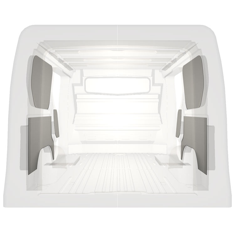 Lekka, wycięta fabrycznie okładzina do ścian wewnętrznych modeli Renault Trafic / Opel Vivaro / Fiat Talento / Nissan NV300 z podwójnymi drzwiami bocznymi. Okładziny tworzą jasne i przyjemne miejsce pracy i są łatwe do wycierania, co ułatwia zachowanie czystości.