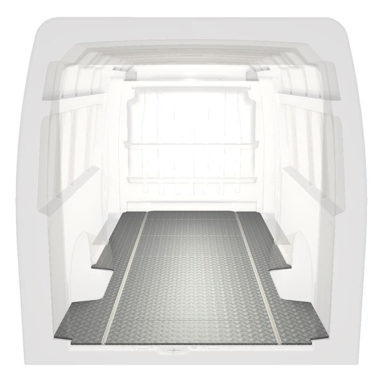 Lekkie i solidne standardowe podłogi do samochodów dostawczych Citroën Jumper / Peugeot Boxer / Fiat Ducato wyposażone w antypoślizgową aluminiową blachę ryflowaną i szyny na ładunek (wzdłużne) umożliwiające szybki i bezpieczny montaż systemów regałowych oraz innych akcesoriów.