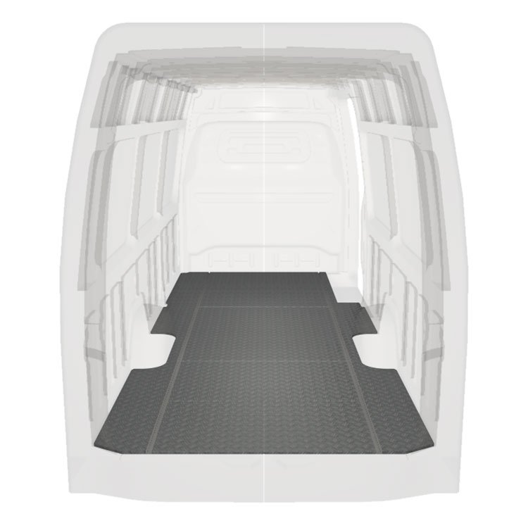 Lekkie i solidne standardowe podłogi do samochodów dostawczych Mercedes Sprinter wyposażone w antypoślizgową aluminiową blachę ryflowaną i szyny na ładunek (wzdłużne) umożliwiające szybki i bezpieczny montaż systemów regałowych oraz innych akcesoriów.
