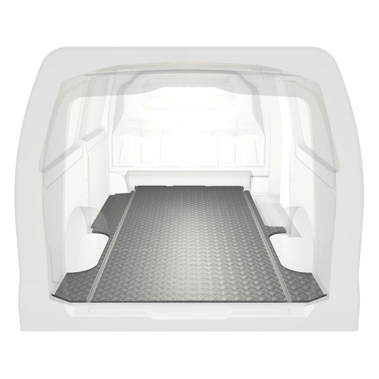 Lekkie i solidne standardowe podłogi do samochodów dostawczych Mercedes Vito wyposażone w antypoślizgową aluminiową blachę ryflowaną i szyny na ładunek (wzdłużne) umożliwiające szybki i bezpieczny montaż systemów regałowych oraz innych akcesoriów.