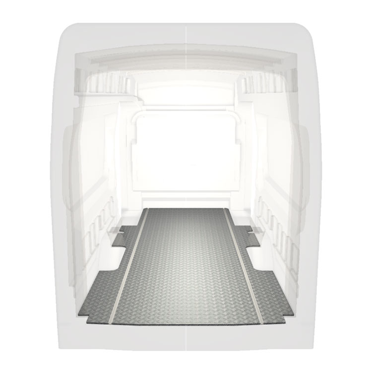 Lekkie i solidne, bardzo długie podłogi do samochodów dostawczych Ford Transit wyposażone w antypoślizgową aluminiową blachę ryflowaną i szyny na ładunek (wzdłużne) umożliwiające szybki i bezpieczny montaż systemów regałowych oraz innych akcesoriów.