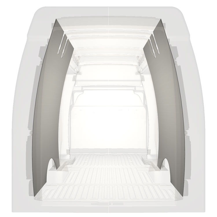 W celu optymalizacji masy, wycięte fabrycznie okładziny do samochodów dostawczych są dopasowane do przestrzeni między belkami pojazdu, co zapewnia ich nieinwazyjność oraz pozwala zmaksymalizować dostępną przestrzeń.