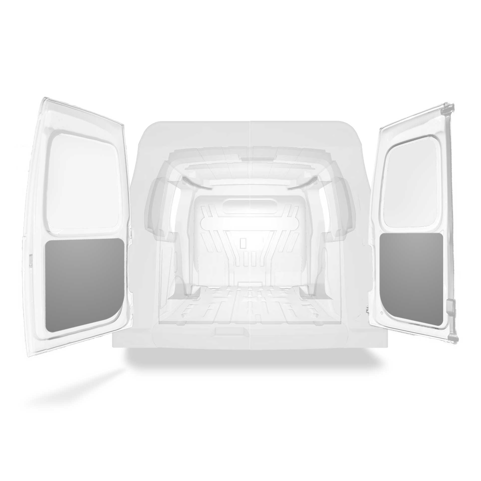 Fabrycznie wycięte okładziny tylnych drzwi samochodu dostawczego są dopasowane do dolnej sekcji bliźniaczych drzwi pojazdu.