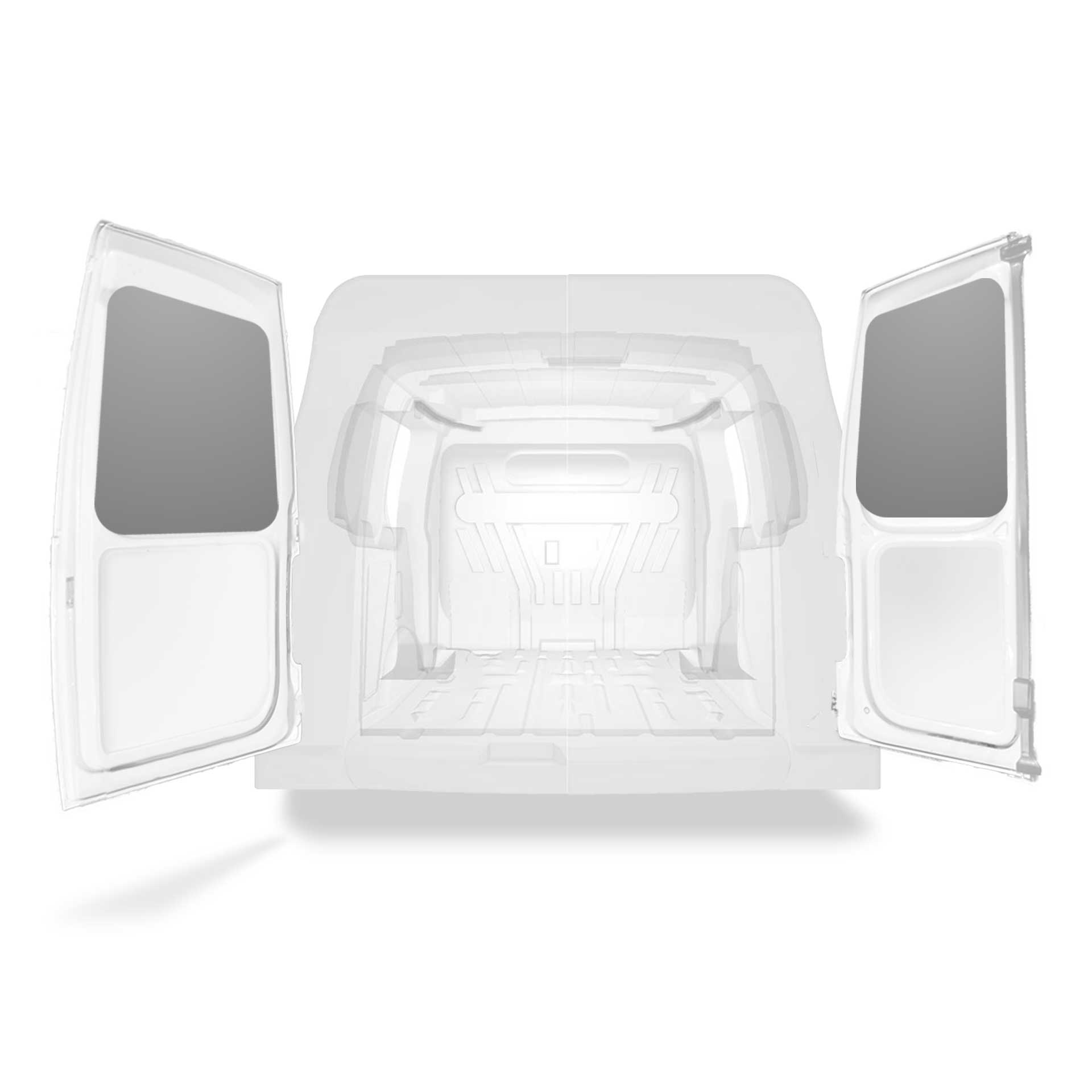 Fabrycznie wycięte okładziny tylnych drzwi samochodu dostawczego są dopasowane do górnej sekcji bliźniaczych drzwi pojazdu.