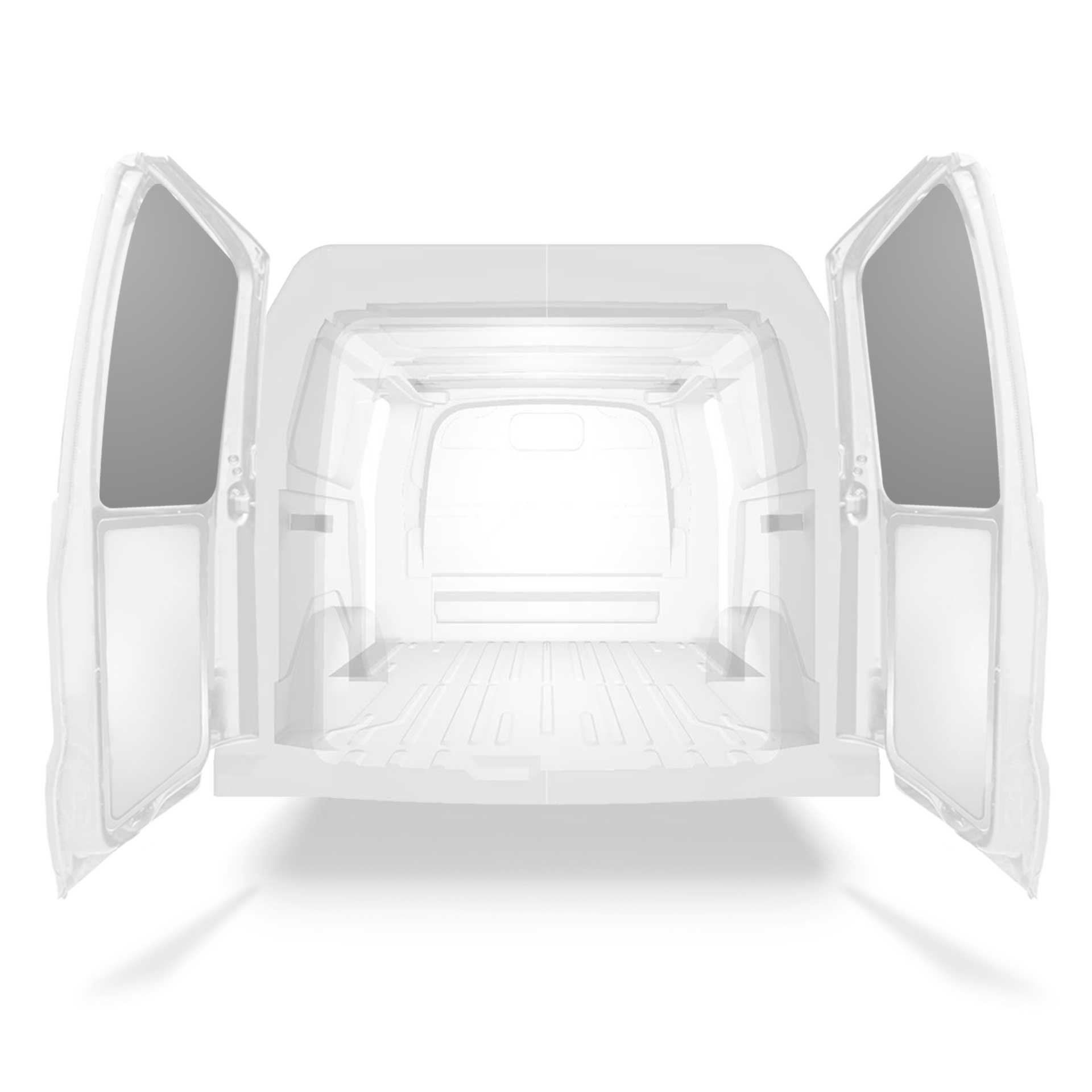 Fabrycznie wycięte okładziny tylnych drzwi samochodu dostawczego są dopasowane do górnej sekcji bliźniaczych drzwi pojazdu.