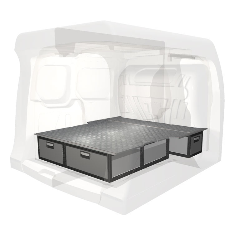 The kit is designed to be fitted on top of a wooden floor. The double floor is equipped with rails for easy installation of vehicle racking, and edging strips for a nice finish.