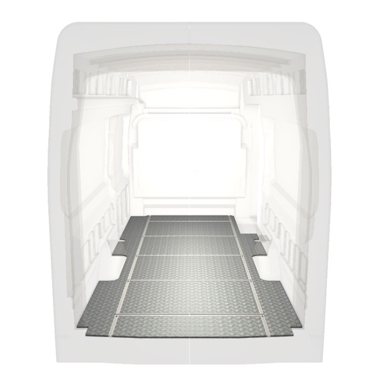 Lekkie i solidne podłogi z szynami poprzecznymi do samochodów dostawczych Ford Transit wyposażone w antypoślizgową aluminiową blachę ryflowaną i szyny na ładunek (wzdłużne oraz poprzeczne) umożliwiające szybki i bezpieczny montaż systemów regałowych oraz innych akcesoriów.