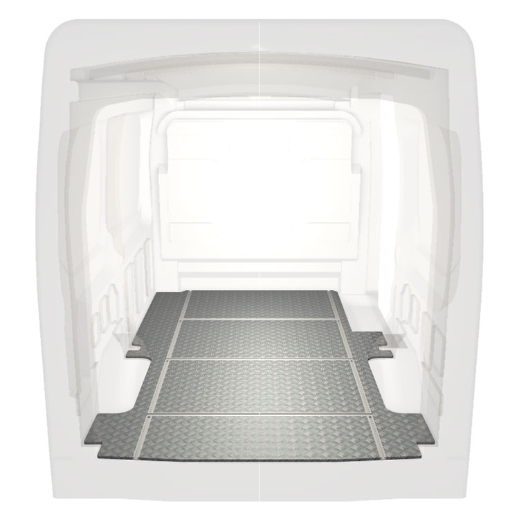 Lekkie i solidne podłogi z szynami poprzecznymi do samochodów dostawczych Ford Transit wyposażone w antypoślizgową aluminiową blachę ryflowaną i szyny na ładunek (wzdłużne oraz poprzeczne) umożliwiające szybki i bezpieczny montaż systemów regałowych oraz innych akcesoriów.