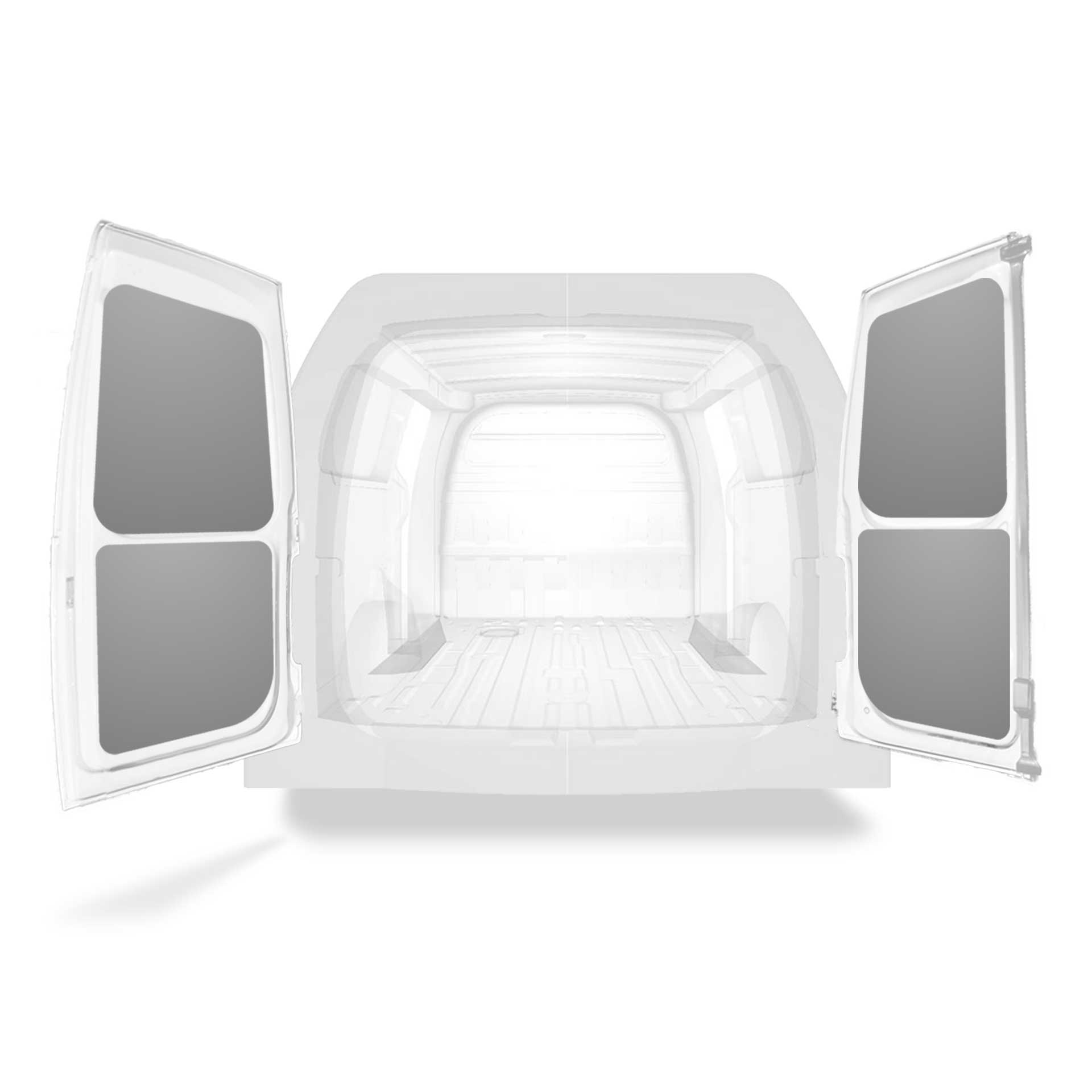 Fabrycznie wycięte okładziny tylnych drzwi samochodu dostawczego są dopasowane do sekcji bliźniaczych drzwi pojazdu.
