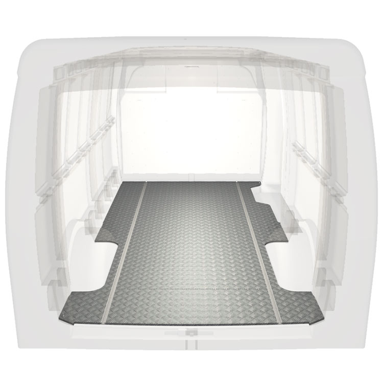 Lekkie i solidne standardowe podłogi do samochodów dostawczych Iveco Daily wyposażone w antypoślizgową aluminiową blachę ryflowaną i szyny na ładunek (wzdłużne) umożliwiające szybki i bezpieczny montaż systemów regałowych oraz innych akcesoriów.