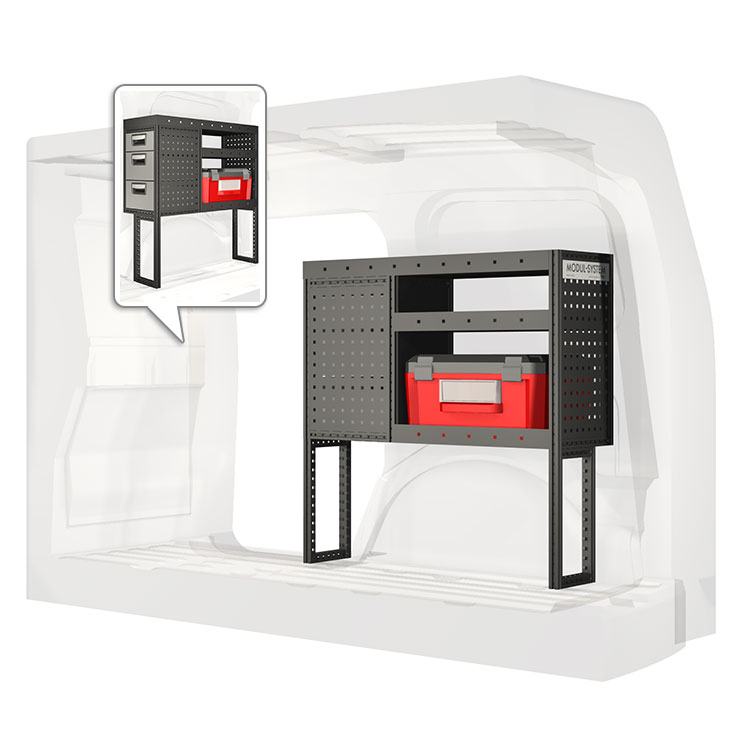 Zabudowa została zaprojektowana w sposób zapewniający optymalne dopasowanie do danego modelu atua przy zachowaniu maksimum funkcjonalności i bezpieczeństwa. Stworzona na potrzeby profesjonalistów, charakteryzuje się elastycznymi rozwiązaniami dla użytkowników z różnych branż. Wszystkie półki wyposażone są w wykładzinę gumową, a szuflady w wykładzinę piankową. Do poszczególnych modułów dołączone są niezbędne materiały montażowe.