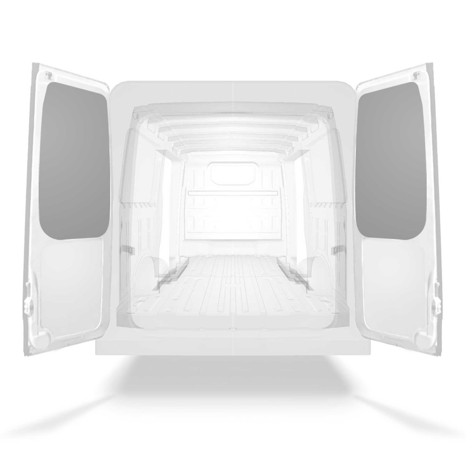 Fabrycznie wycięte okładziny tylnych drzwi samochodu dostawczego są dopasowane do górnej sekcji bliźniaczych drzwi pojazdu.