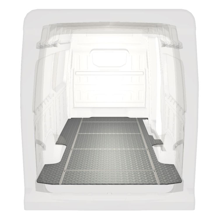 Lekkie i solidne podłogi z szynami poprzecznymi do samochodów dostawczych Volkswagen Crafter / MAN TGE wyposażone w antypoślizgową aluminiową blachę ryflowaną i szyny na ładunek (wzdłużne oraz poprzeczne) umożliwiające szybki i bezpieczny montaż systemów regałowych oraz innych akcesoriów.