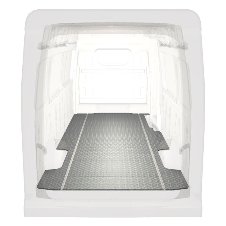 Lekkie i solidne standardowe podłogi do samochodów dostawczych Volkswagen Crafter / MAN TGE wyposażone w antypoślizgową aluminiową blachę ryflowaną i szyny na ładunek (wzdłużne) umożliwiające szybki i bezpieczny montaż systemów regałowych oraz innych akcesoriów.