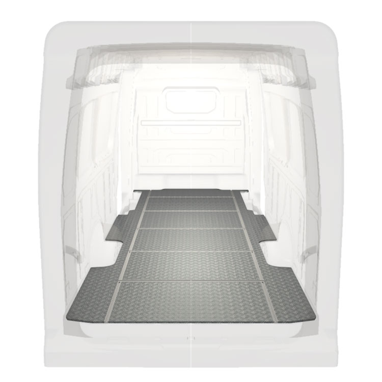 Lekkie i solidne podłogi z szynami poprzecznymi do samochodów dostawczych Volkswagen Crafter / MAN TGE wyposażone w antypoślizgową aluminiową blachę ryflowaną i szyny na ładunek (wzdłużne oraz poprzeczne) umożliwiające szybki i bezpieczny montaż systemów regałowych oraz innych akcesoriów.
