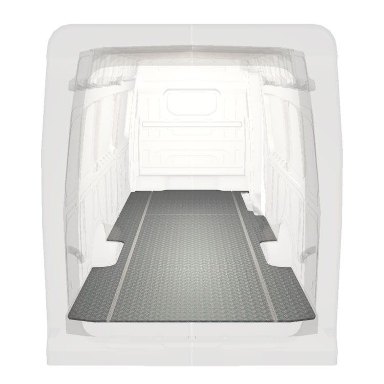 Lekkie i solidne standardowe podłogi do samochodów dostawczych Volkswagen Crafter / MAN TGE wyposażone w antypoślizgową aluminiową blachę ryflowaną i szyny na ładunek (wzdłużne) umożliwiające szybki i bezpieczny montaż systemów regałowych oraz innych akcesoriów.