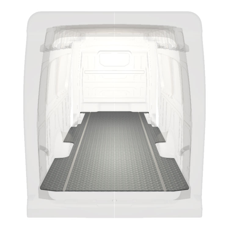 Lekkie i solidne, bardzo długie podłogi do samochodów dostawczych Volkswagen Crafter / MAN TGE wyposażone w antypoślizgową aluminiową blachę ryflowaną i szyny na ładunek (wzdłużne) umożliwiające szybki i bezpieczny montaż systemów regałowych oraz innych akcesoriów.