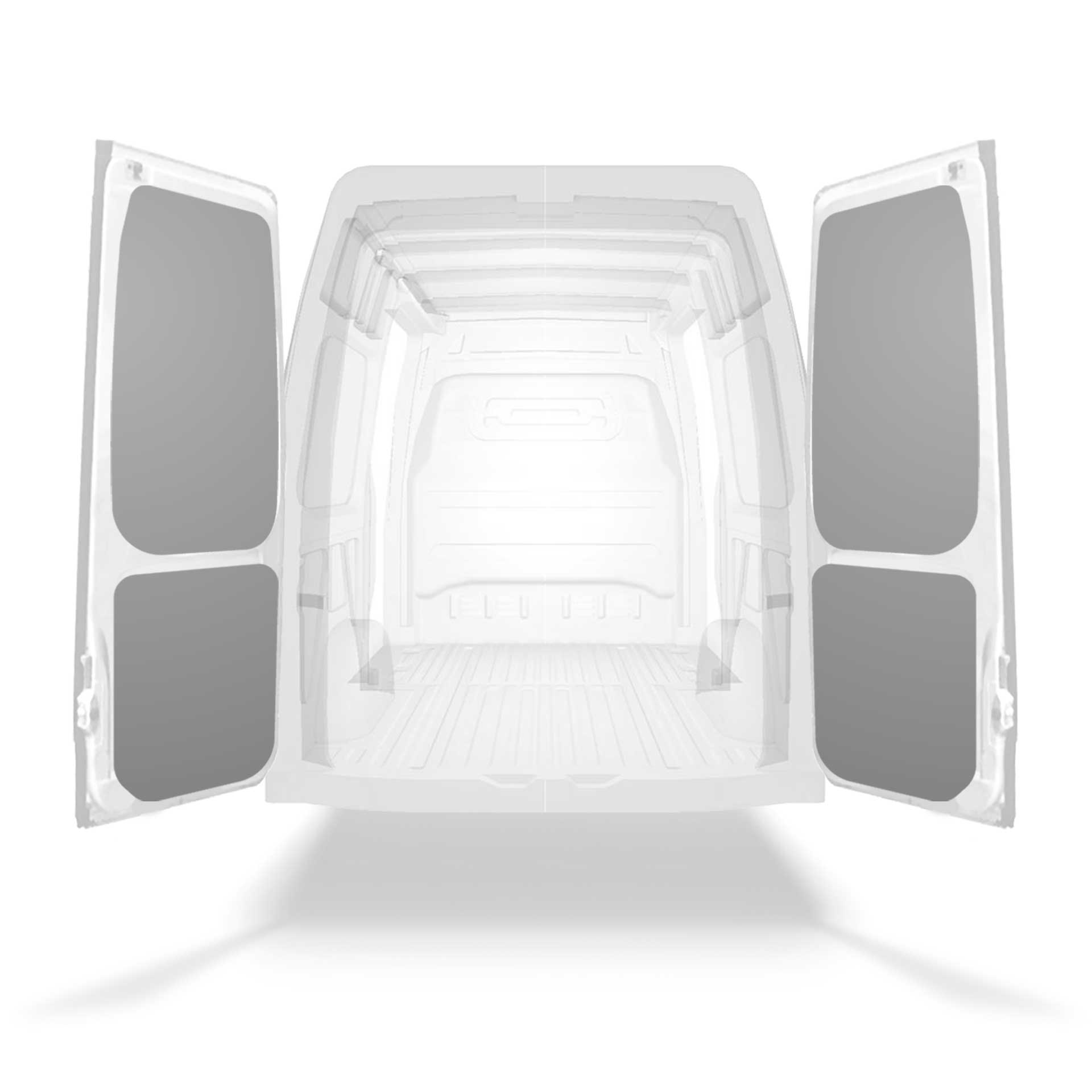 Fabrycznie wycięte okładziny tylnych drzwi samochodu dostawczego są dopasowane do sekcji bliźniaczych drzwi pojazdu.