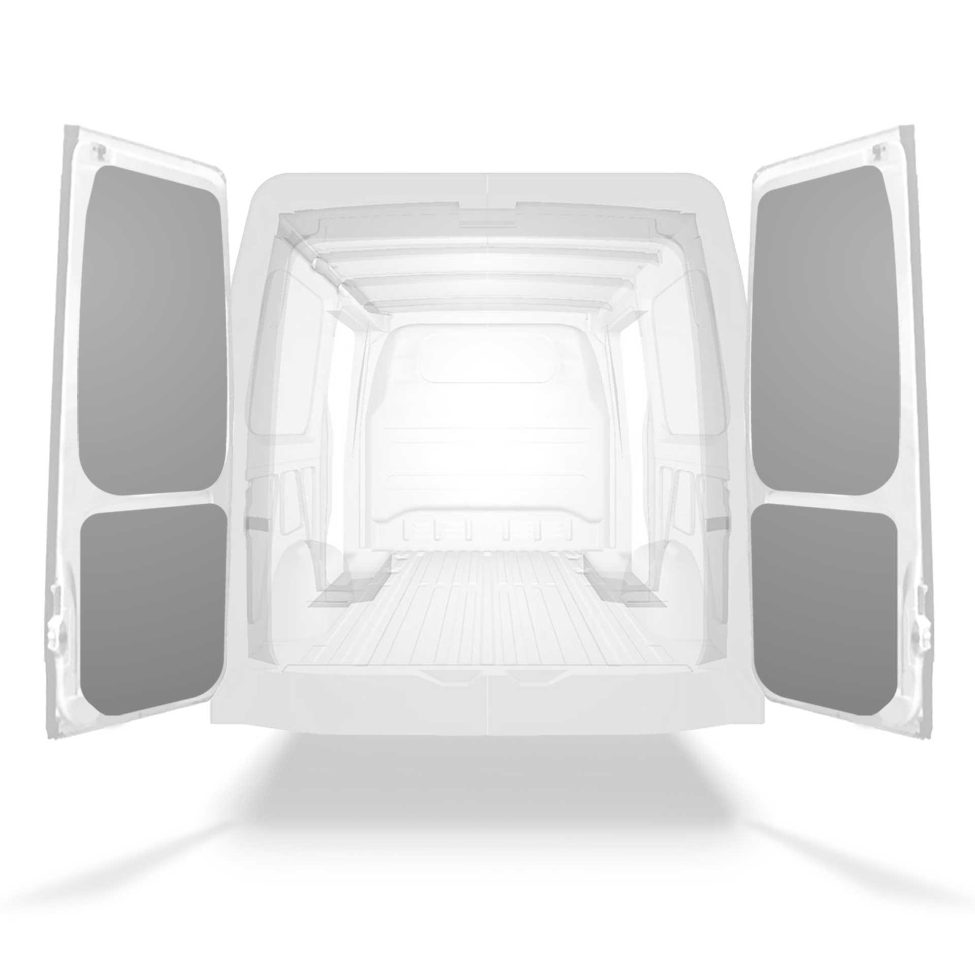 Fabrycznie wycięte okładziny tylnych drzwi samochodu dostawczego są dopasowane do sekcji bliźniaczych drzwi pojazdu.