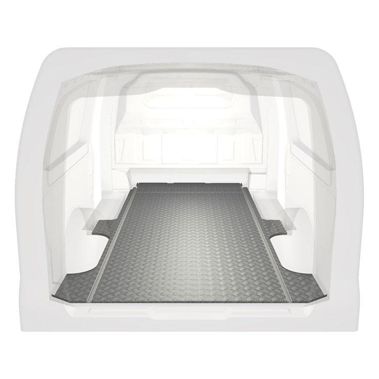 Lekkie i solidne, bardzo długie podłogi do samochodów dostawczych Mercedes Vito wyposażone w antypoślizgową aluminiową blachę ryflowaną i szyny na ładunek (wzdłużne) umożliwiające szybki i bezpieczny montaż systemów regałowych oraz innych akcesoriów.