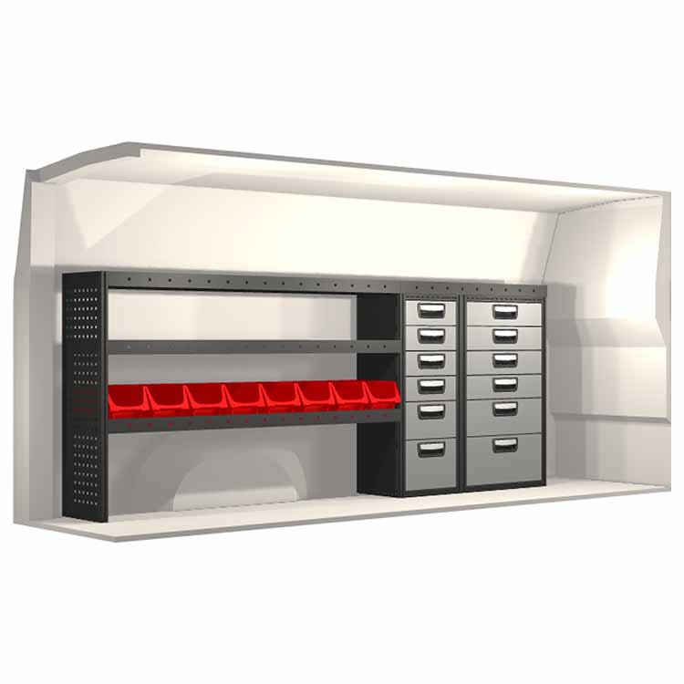 Zabudowa została zaprojektowana w sposób zapewniający optymalne dopasowanie do danego modelu atua przy zachowaniu maksimum funkcjonalności i bezpieczeństwa. Stworzona na potrzeby profesjonalistów, charakteryzuje się elastycznymi rozwiązaniami dla użytkowników z różnych branż. Wszystkie półki wyposażone są w wykładzinę gumową, a szuflady w wykładzinę piankową. Do poszczególnych modułów dołączone są niezbędne materiały montażowe.