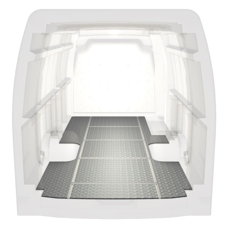 Lekkie i solidne podłogi z szynami poprzecznymi do samochodów dostawczych Renault Master / Opel Movano / Nissan NV400 wyposażone w antypoślizgową aluminiową blachę ryflowaną i szyny na ładunek (wzdłużne oraz poprzeczne) umożliwiające szybki i bezpieczny montaż systemów regałowych oraz innych akcesoriów.