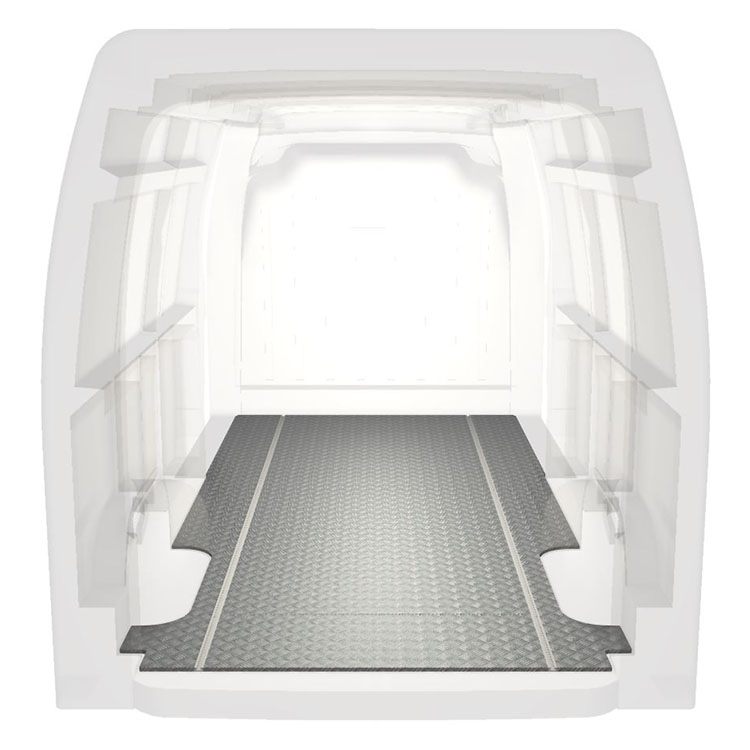 Lekkie i solidne standardowe podłogi do samochodów dostawczych Renault Master / Opel Movano / Nissan NV400 wyposażone w antypoślizgową aluminiową blachę ryflowaną i szyny na ładunek (wzdłużne) umożliwiające szybki i bezpieczny montaż systemów regałowych oraz innych akcesoriów.