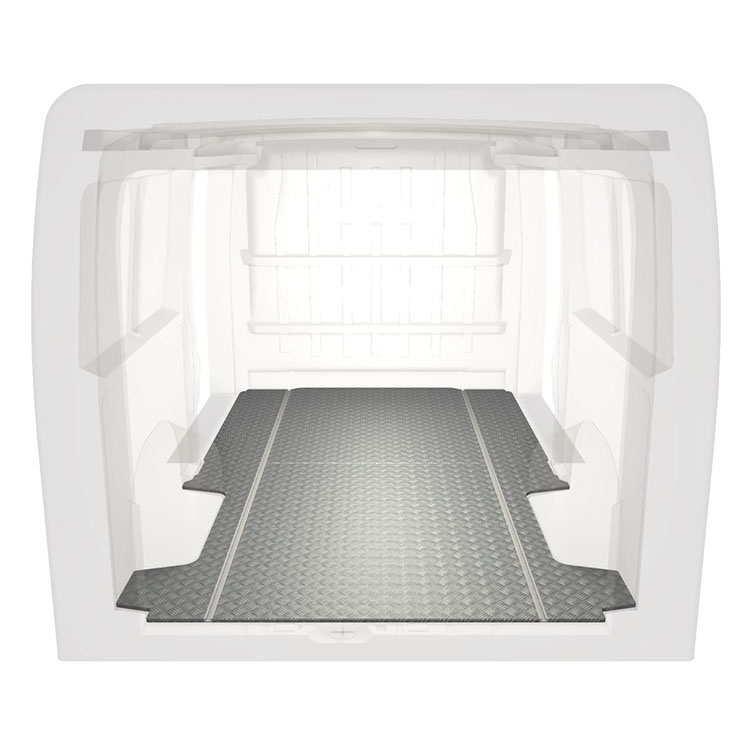 Lekkie i solidne standardowe podłogi do samochodów dostawczych Citroën Jumper / Peugeot Boxer / Fiat Ducato wyposażone w antypoślizgową aluminiową blachę ryflowaną i szyny na ładunek (wzdłużne) umożliwiające szybki i bezpieczny montaż systemów regałowych oraz innych akcesoriów.