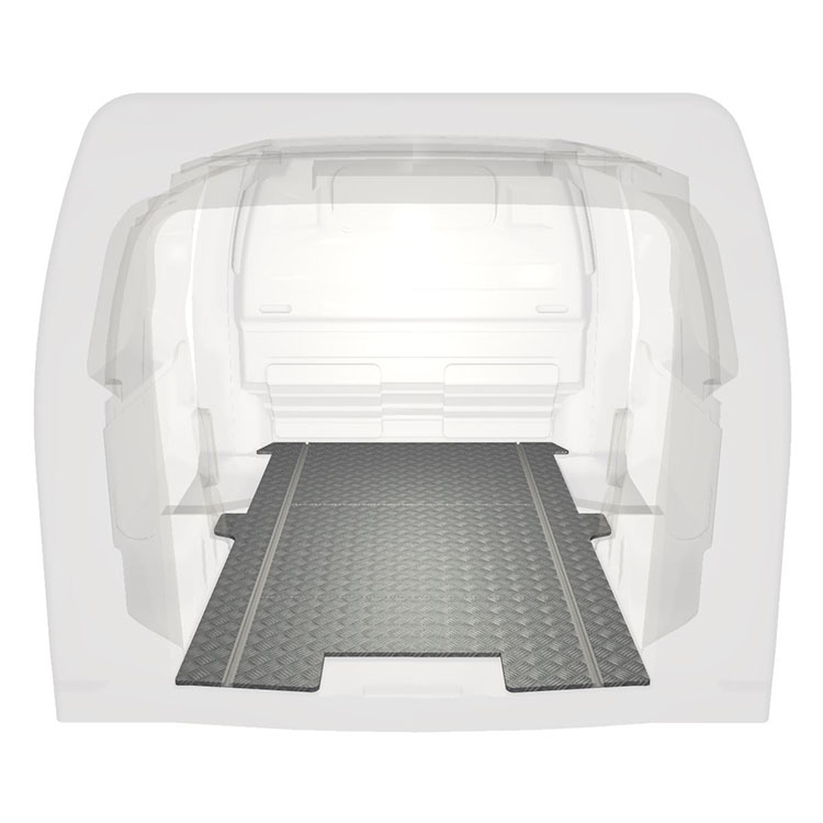 Lekkie i solidne standardowe podłogi do samochodów dostawczych Citroën Jumpy / Peugeot Expert / Toyota ProAce wyposażone w antypoślizgową aluminiową blachę ryflowaną i szyny na ładunek (wzdłużne) umożliwiające szybki i bezpieczny montaż systemów regałowych oraz innych akcesoriów.