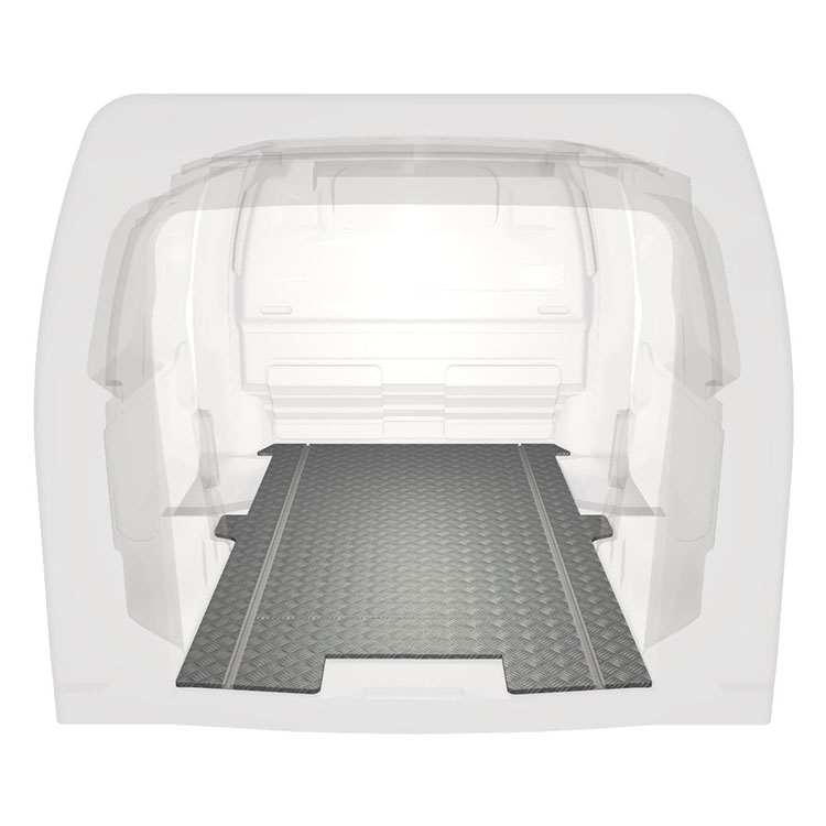 Lekkie i solidne, bardzo długie podłogi do samochodów dostawczych Citroën Jumpy / Peugeot Expert / Toyota ProAce wyposażone w antypoślizgową aluminiową blachę ryflowaną i szyny na ładunek (wzdłużne) umożliwiające szybki i bezpieczny montaż systemów regałowych oraz innych akcesoriów.