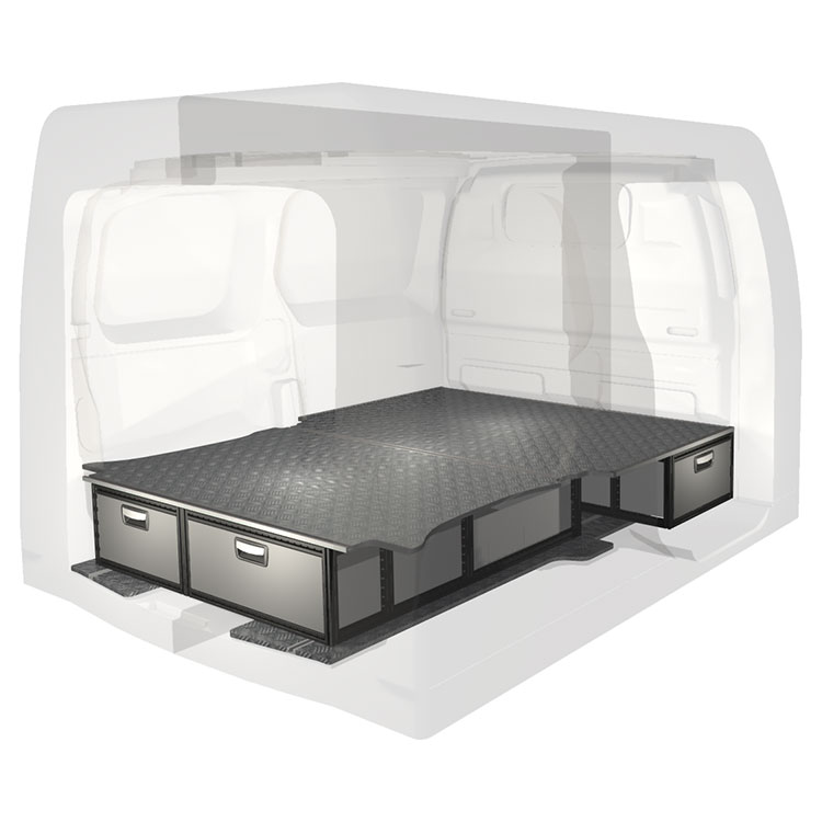 The kit is designed to be fitted on top of a Modul-Floor, utilizing the floor rails for a non-intrusive installation. The double floor is equipped with rails for easy installation of vehicle racking, and edging strips for a nice finish.