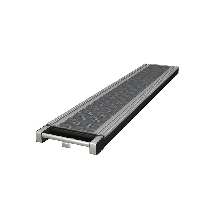 Lightweight and robust base frame made from ultra-high strength steel, with a front in anodized aluminum and a loading platform in lightweight sandwich material with an aluminum top.