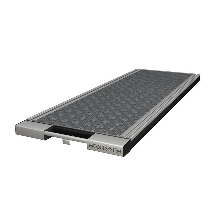 Lightweight and robust base frame made from ultra-high strength steel, with a front in anodized aluminum and a loading platform in lightweight sandwich material with an aluminum top.