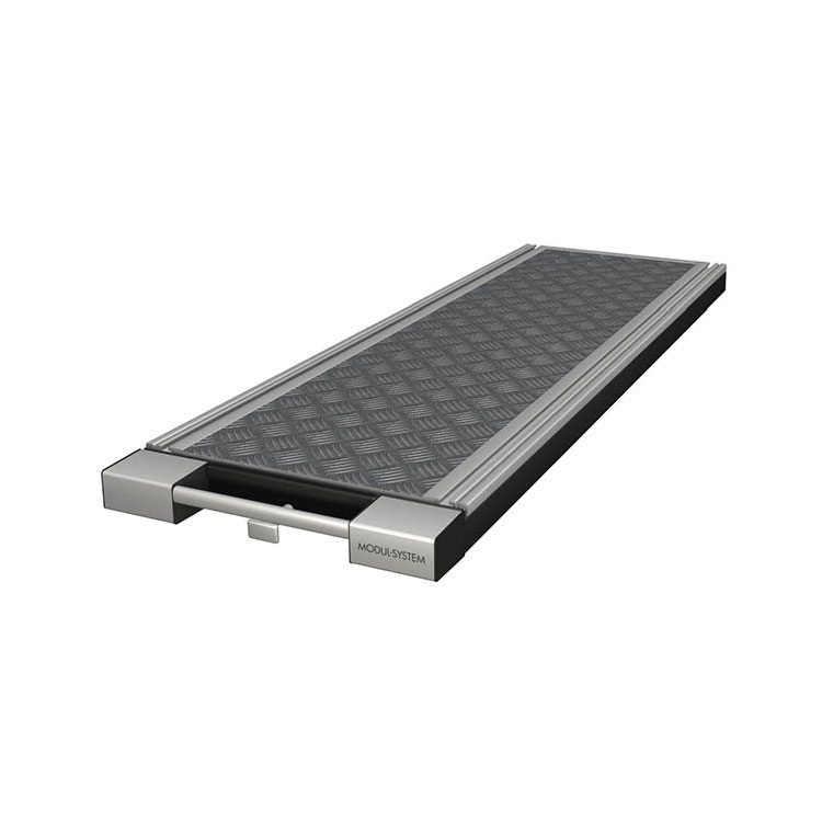 Lightweight and robust base frame made from ultra-high strength steel, with a front in anodized aluminum and a loading platform in lightweight sandwich material with an aluminum top.