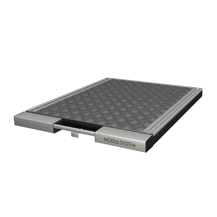 Lightweight and robust base frame made from ultra-high strength steel, with a front in anodized aluminum and a loading platform in lightweight sandwich material with an aluminum top.