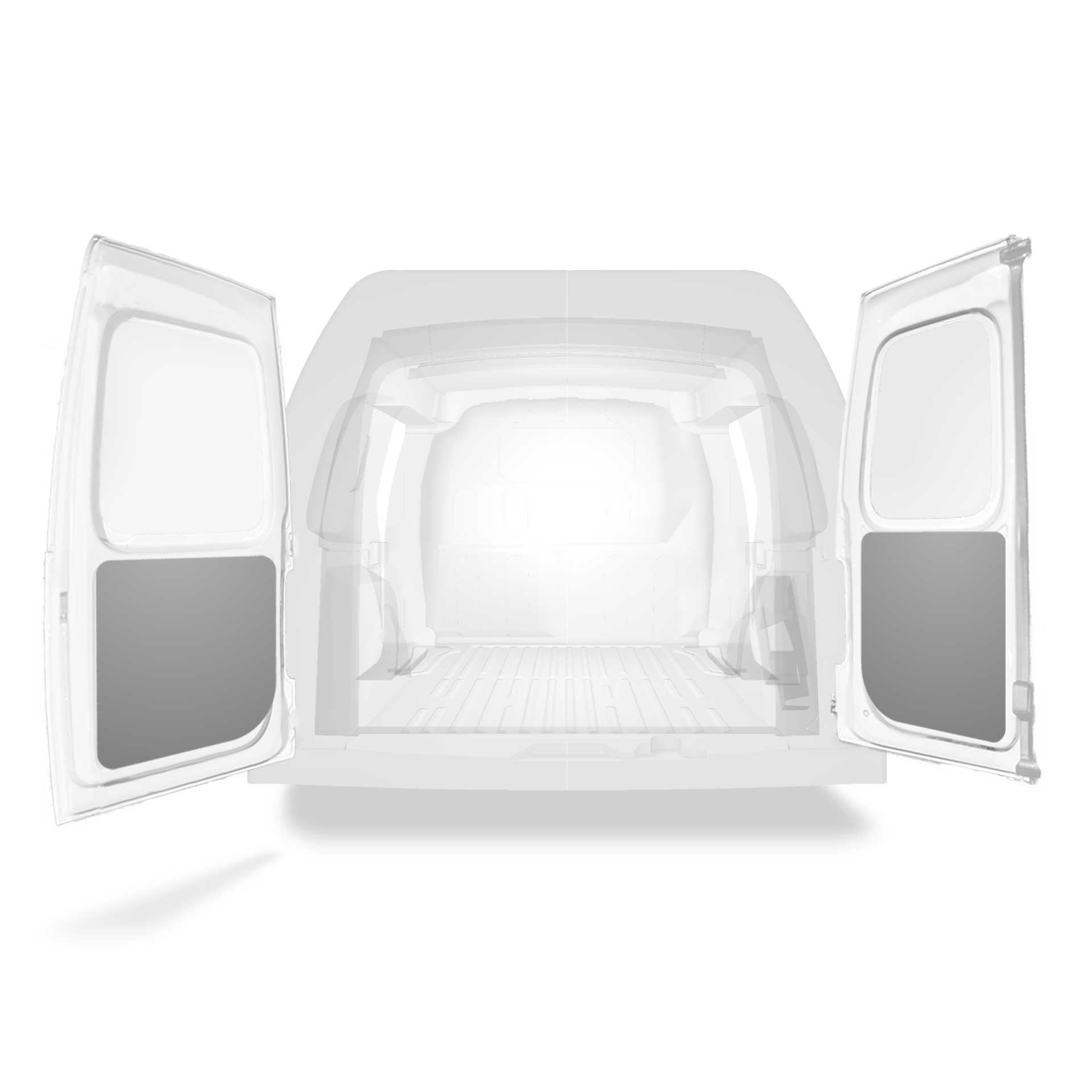 Fabrycznie wycięte okładziny tylnych drzwi samochodu dostawczego są dopasowane do dolnej sekcji bliźniaczych drzwi pojazdu.