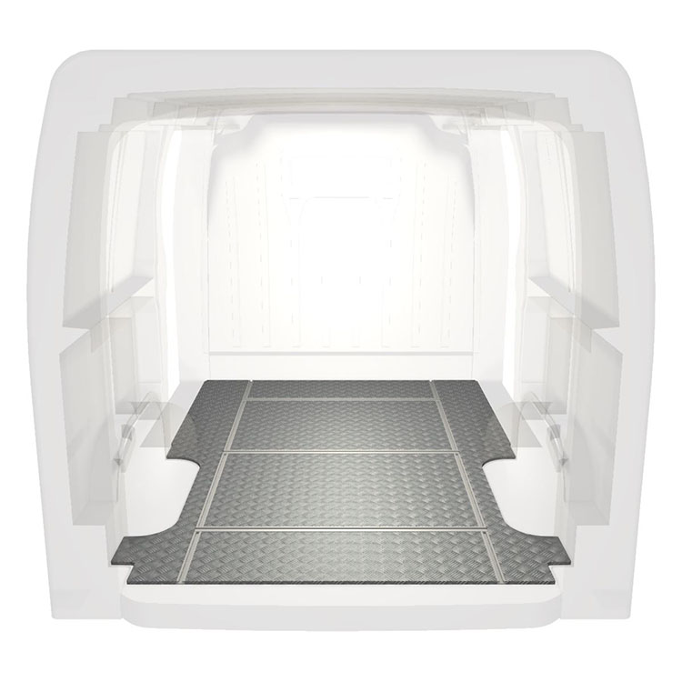 Lekkie i solidne podłogi z szynami poprzecznymi do samochodów dostawczych Renault Master / Opel Movano / Nissan NV400 wyposażone w antypoślizgową aluminiową blachę ryflowaną i szyny na ładunek (wzdłużne oraz poprzeczne) umożliwiające szybki i bezpieczny montaż systemów regałowych oraz innych akcesoriów.