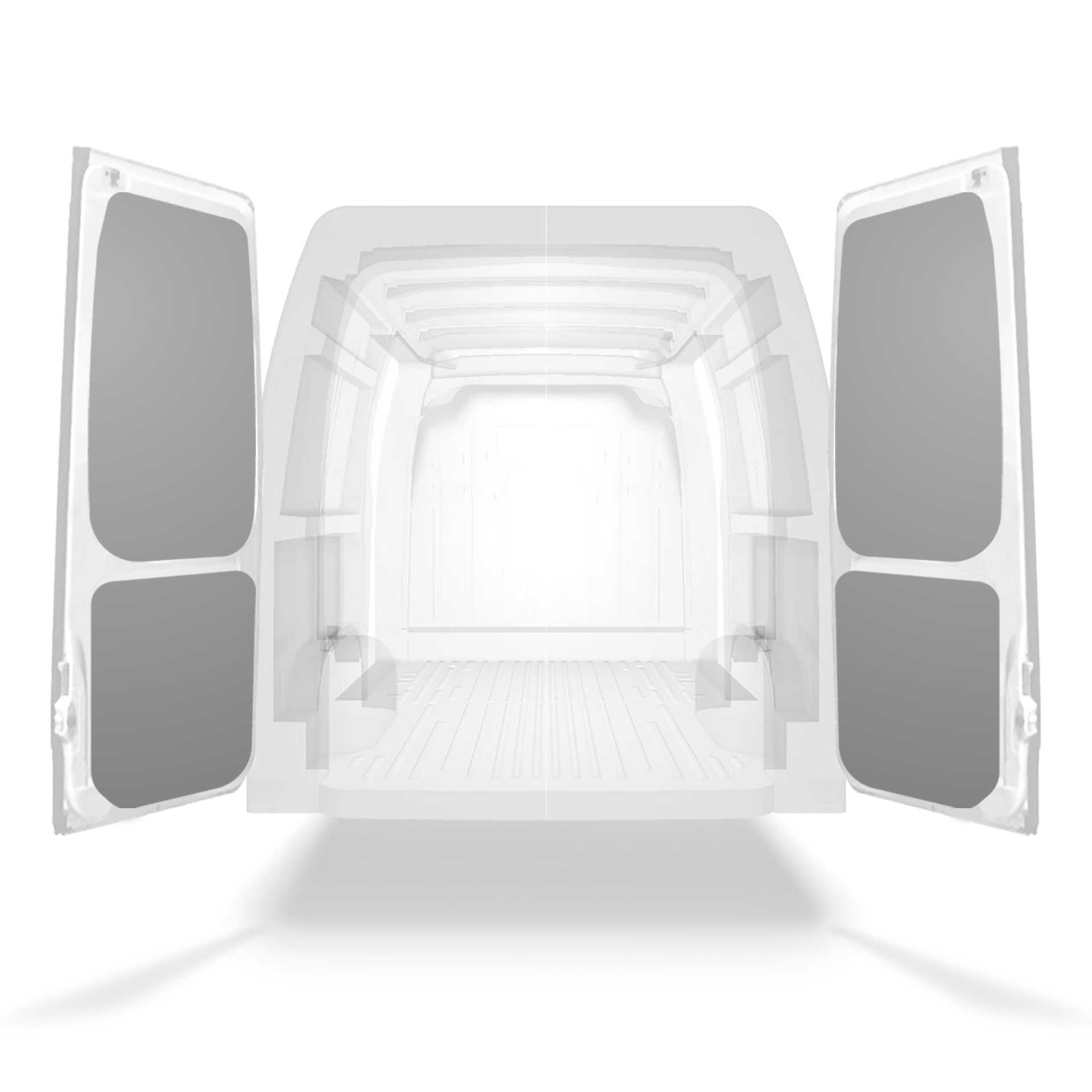 Fabrycznie wycięte okładziny tylnych drzwi samochodu dostawczego są dopasowane do sekcji bliźniaczych drzwi pojazdu.