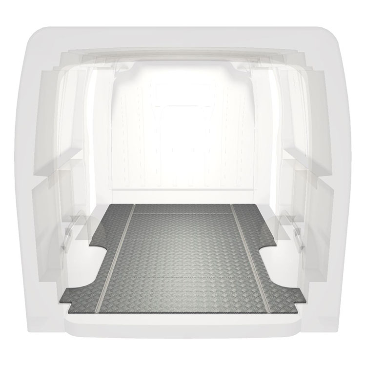 Lekkie i solidne standardowe podłogi do samochodów dostawczych Renault Master / Opel Movano / Nissan NV400 wyposażone w antypoślizgową aluminiową blachę ryflowaną i szyny na ładunek (wzdłużne) umożliwiające szybki i bezpieczny montaż systemów regałowych oraz innych akcesoriów.