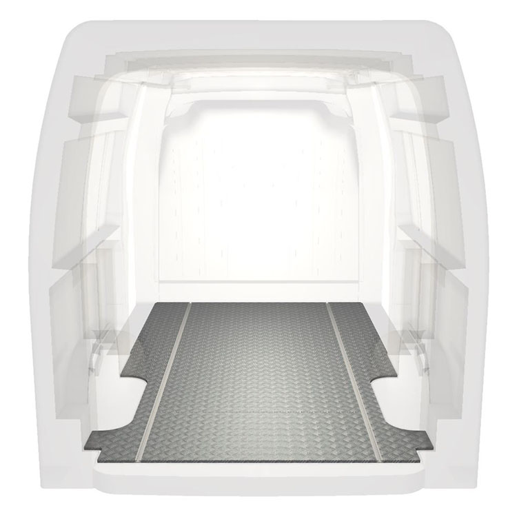 Lekkie i solidne standardowe podłogi do samochodów dostawczych Renault Master / Opel Movano / Nissan NV400 wyposażone w antypoślizgową aluminiową blachę ryflowaną i szyny na ładunek (wzdłużne) umożliwiające szybki i bezpieczny montaż systemów regałowych oraz innych akcesoriów.