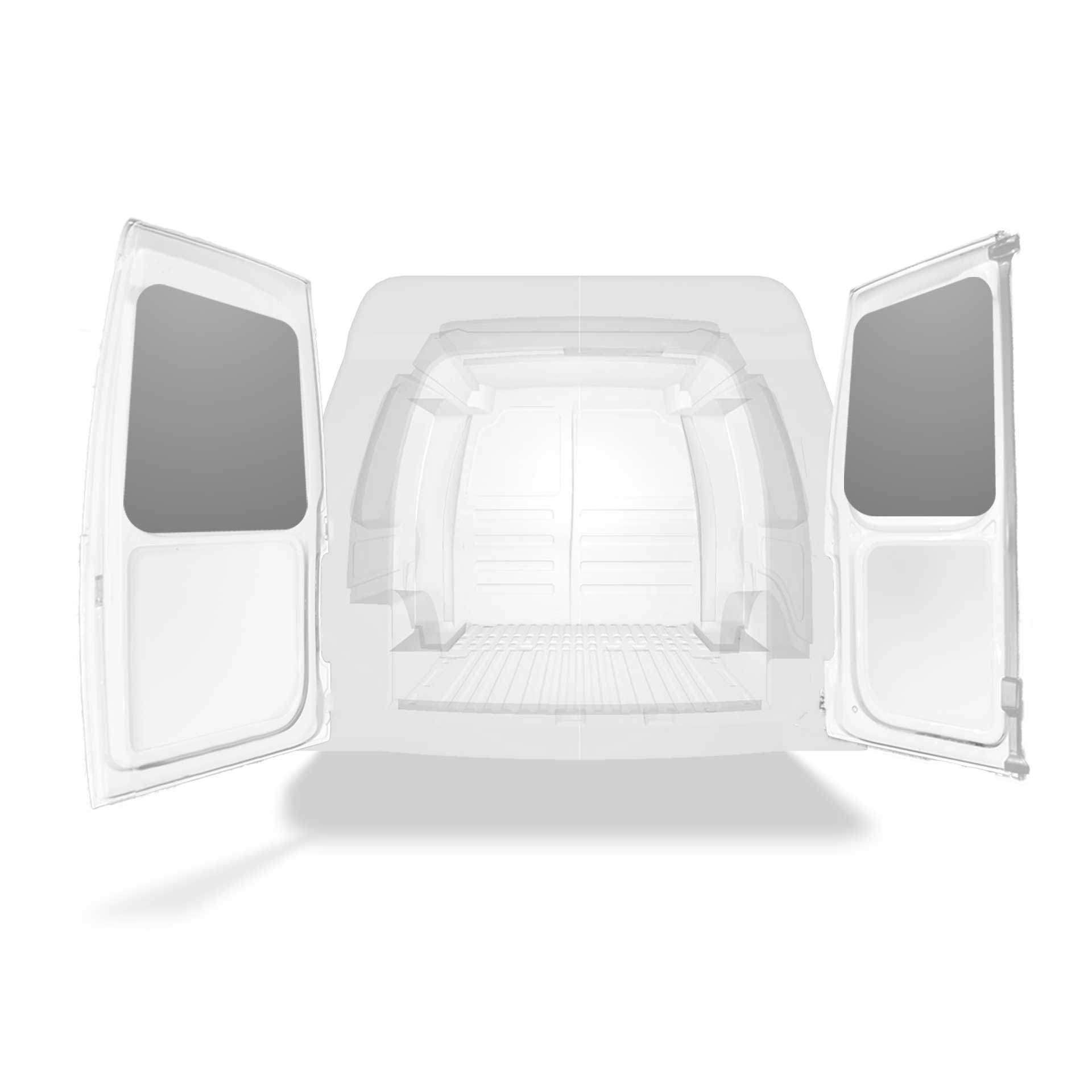 Fabrycznie wycięte okładziny tylnych drzwi samochodu dostawczego są dopasowane do górnej sekcji bliźniaczych drzwi pojazdu.