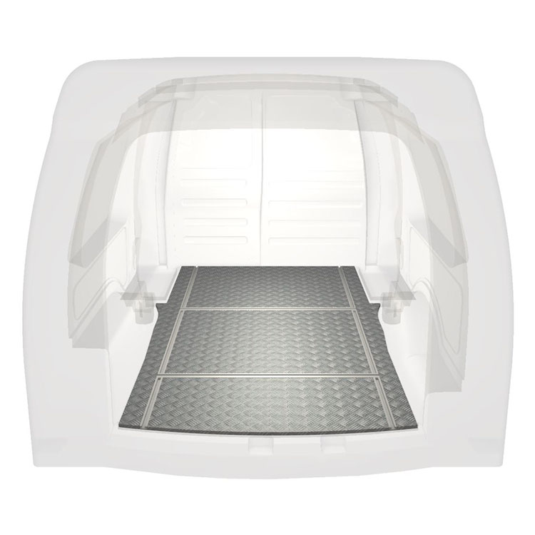 Lekkie i solidne podłogi z szynami poprzecznymi do samochodów dostawczych Volkswagen Caddy Maxi wyposażone w antypoślizgową aluminiową blachę ryflowaną i szyny na ładunek (wzdłużne oraz poprzeczne) umożliwiające szybki i bezpieczny montaż systemów regałowych oraz innych akcesoriów.