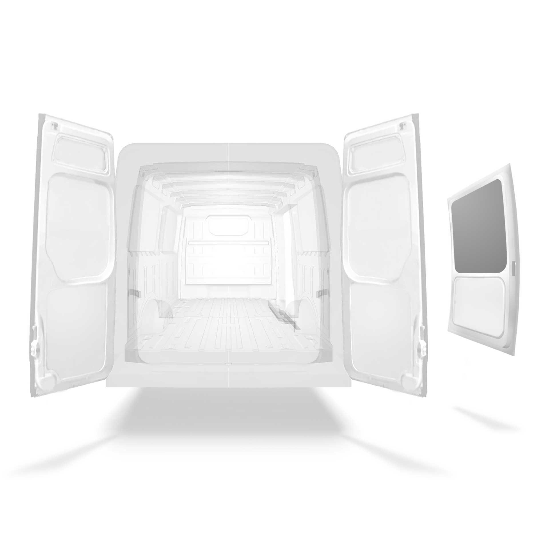 Lekka okładzina do górnej części bocznych drzwi modeli Volkswagen Crafter / MAN TGE z drzwiami bocznymi po prawej stronie. Okładzina zmniejsza zużycie wnętrza i pomaga utrzymać wartość samochodu dostawczego.